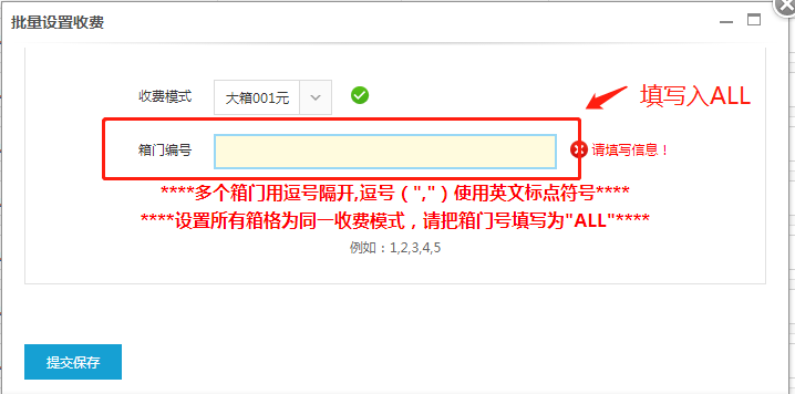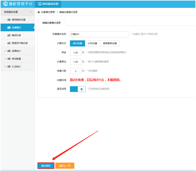 ○3 設(shè)置完之后“提交保存”即可(這里我們?cè)O(shè)置全部箱門收費(fèi)模式為“大箱001