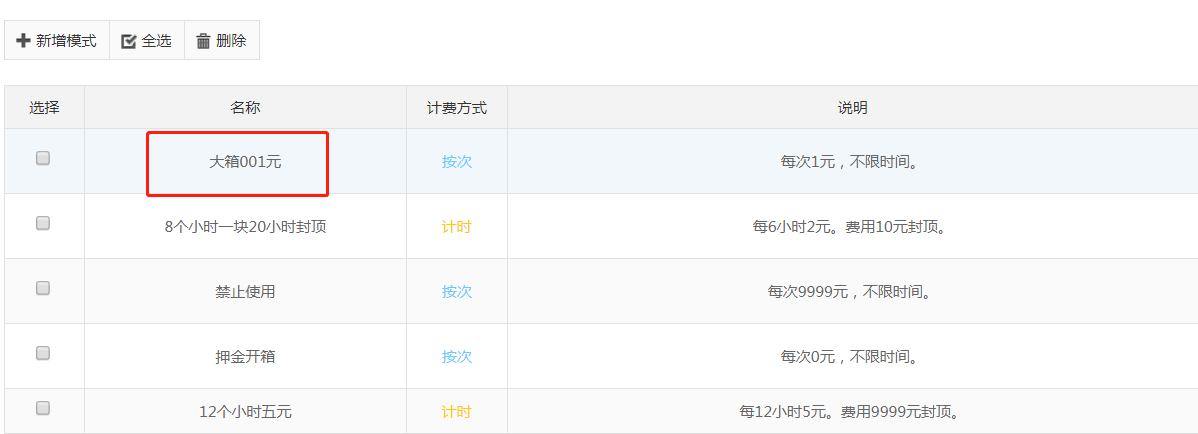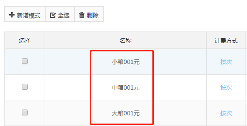 這里我們以設(shè)置的三種收費(fèi)模式(分別為“大箱 001”、“中箱 001”、“小箱