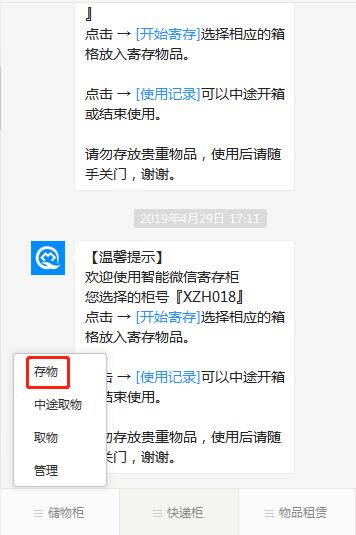 1)使用人在使用微信柜時(shí),首次使用需打開微信掃一掃,掃屏幕二維碼碼關(guān)注公眾號(hào),關(guān)注后進(jìn)入公眾號(hào)內(nèi),點(diǎn)擊“存物”菜單(如圖1-1),掃碼選柜。