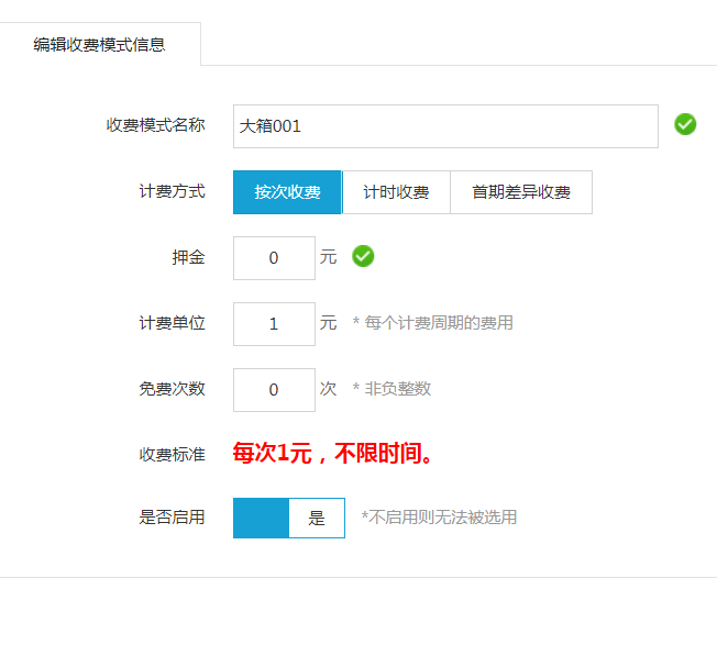 2) 這里我們以按次收費(fèi)方式為例,設(shè)置收費(fèi)模式參考如下: