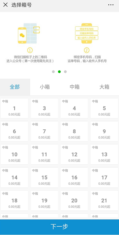 2)點(diǎn)擊“存物”按鈕后,掃屏幕二維碼即可進(jìn)入選箱界面(如圖1-2),選擇箱門號(hào),點(diǎn)擊下一步,根據(jù)頁面提示并打開箱門,存入物品后請(qǐng)隨手關(guān)門。