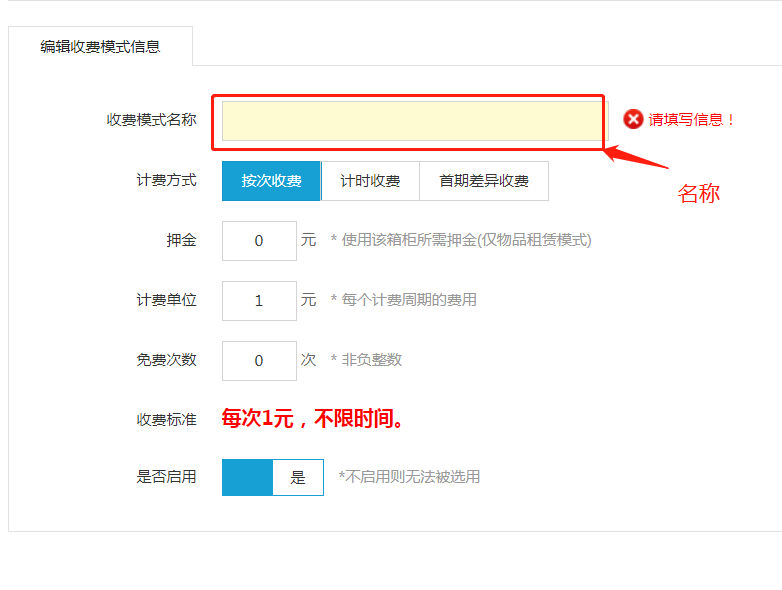 1) 我們可以根據(jù)自己需求對(duì)收費(fèi)模式命名、設(shè)置計(jì)費(fèi)方式(按次收費(fèi)、計(jì)